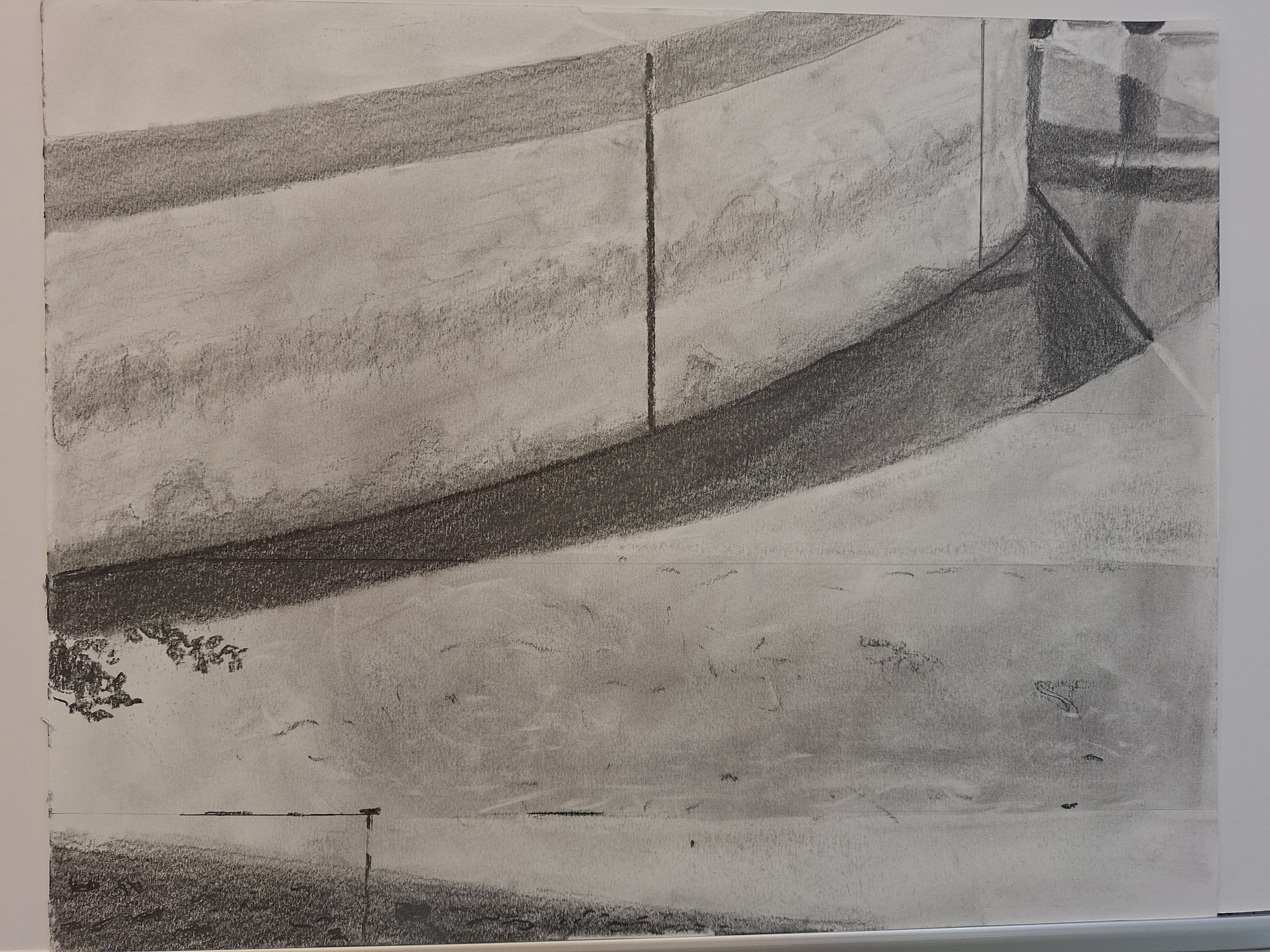 I started with a graphite powder wash, but realized that it hid the slab breaks in the foreground. Graphite powder is hard to remove, so I scrubbed with an eraser, leaving the middle slab in the foreground. This yielded speckling in the slab above it – a pleasant surprise.